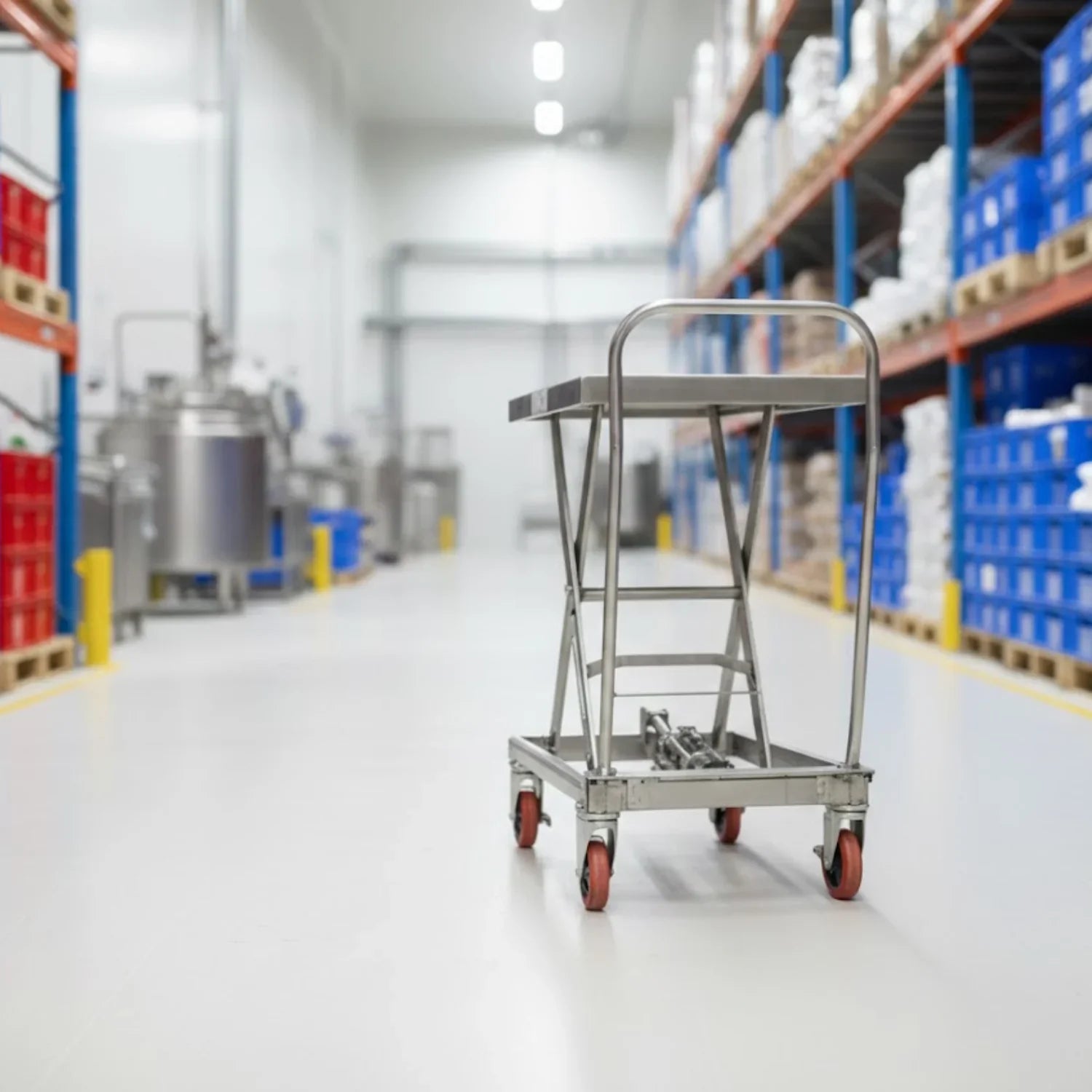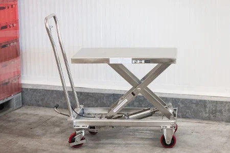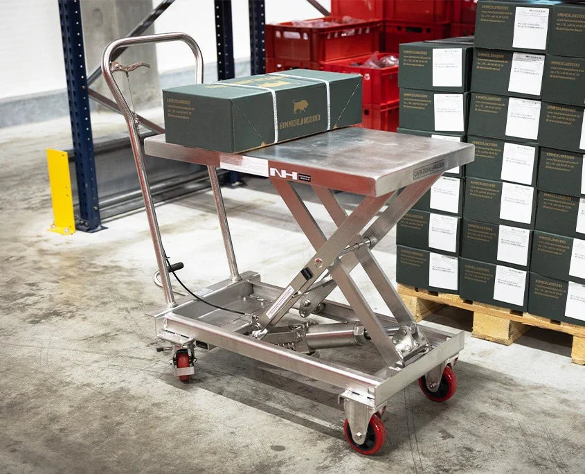 Rustfri løftevogn til hygiejnefølsomme miljøer. Giver korrekt arbejdshøjde og sikker håndtering i fødevareproduktion, storkøkkener og rene produktionsområder.