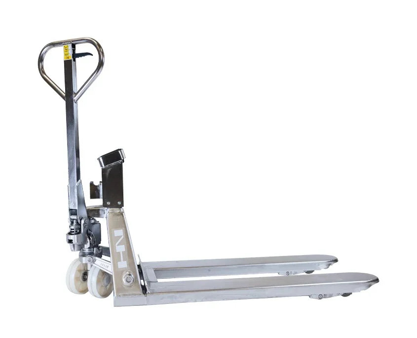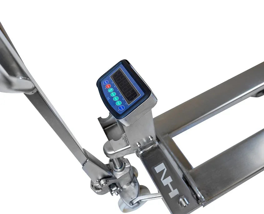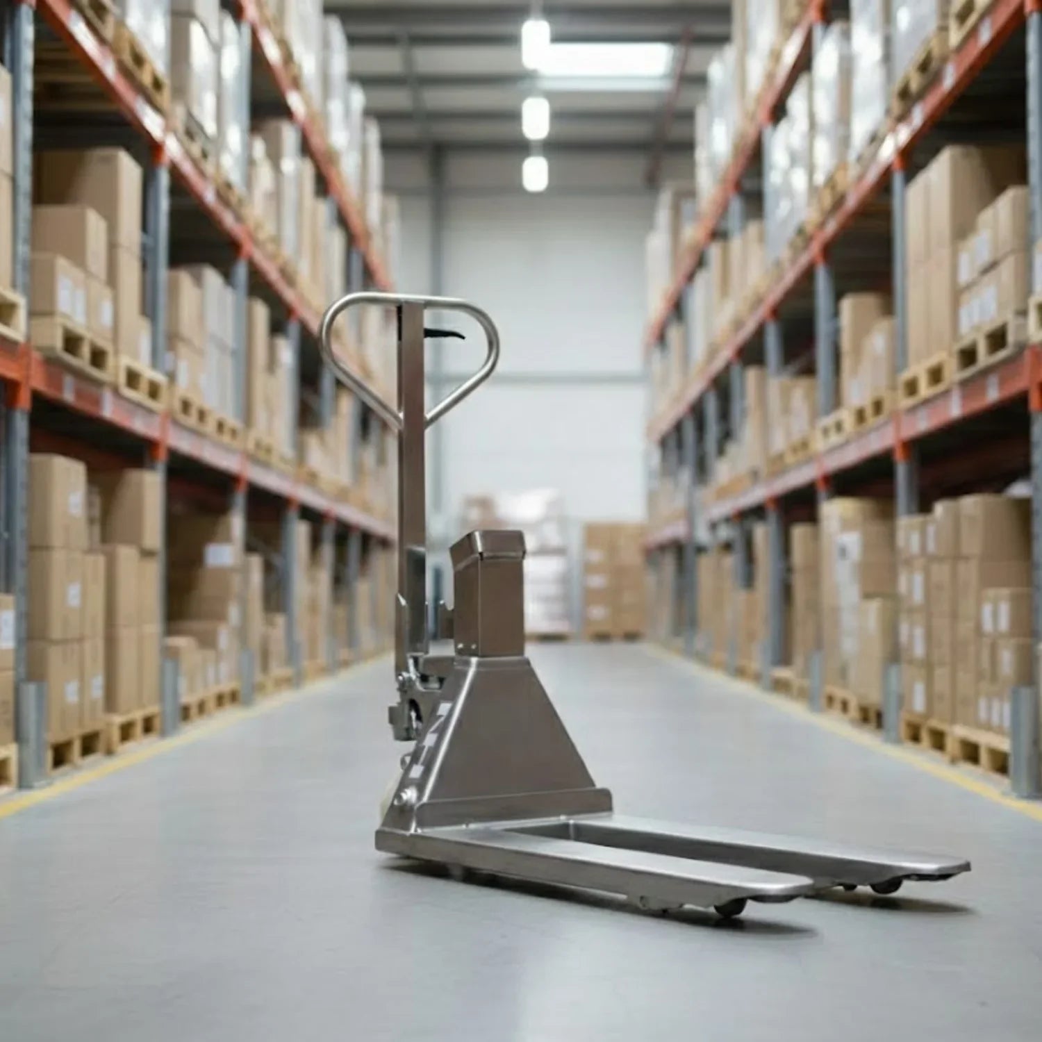 Rustfri palleløfter med indbygget vægt til hygiejnefølsomme miljøer. Velegnet til fødevareproduktion, pharma og rene produktionsområder, hvor præcis vejning og rengøringsvenlige materialer er afgørende.